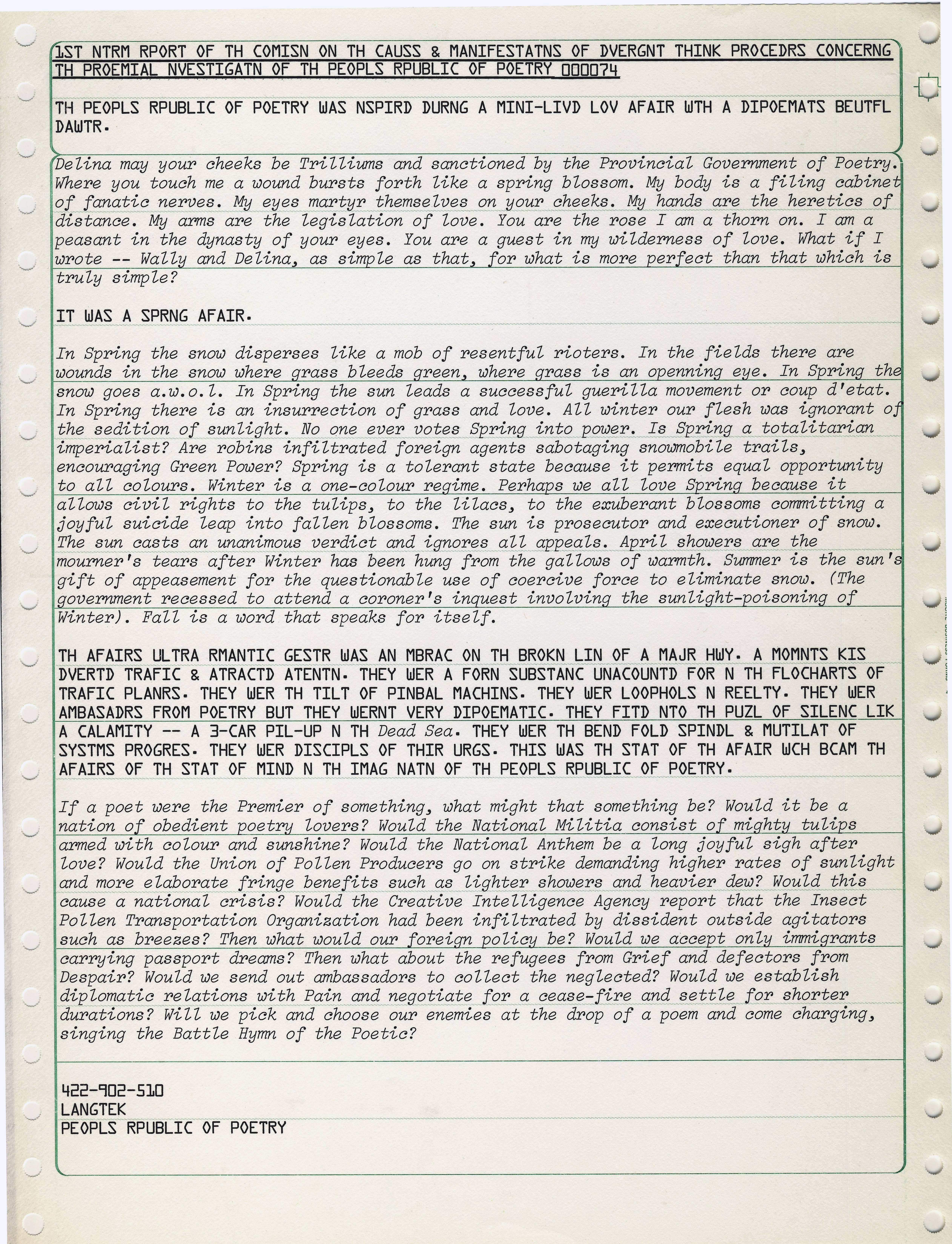 The technology began to inform the way I began to perceive the world. It also began to inform my poetry. I began to write ‘prose-poetry’. I wrote several pieces, one of them was in the form of a spontaneous computer printout. In idiomspeak, it’s called the Politics of Spring.