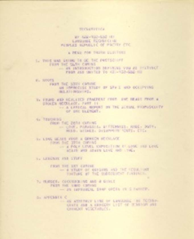 I billed myself as LANGTEK (Language Technician) and continued to send poems to Canada’s literary journals. Sometimes I would bill it with a PRP Dept, Ministry of Textraordinary Affairs, or Creative Intelligence Agency or Federal Bureau of Inspiration. The poetry was still ‘regular’ except for my various pseudonyms. For the next 15 years, everything published was via my Single Identifying Number, known in Canada as a Social Insurance Number. ”Wally Keeler” soon disappeared from the scene. My SIN was my avatar, indeed, the entire apparatus of the Peoples Republic of Poetry became my avatar.